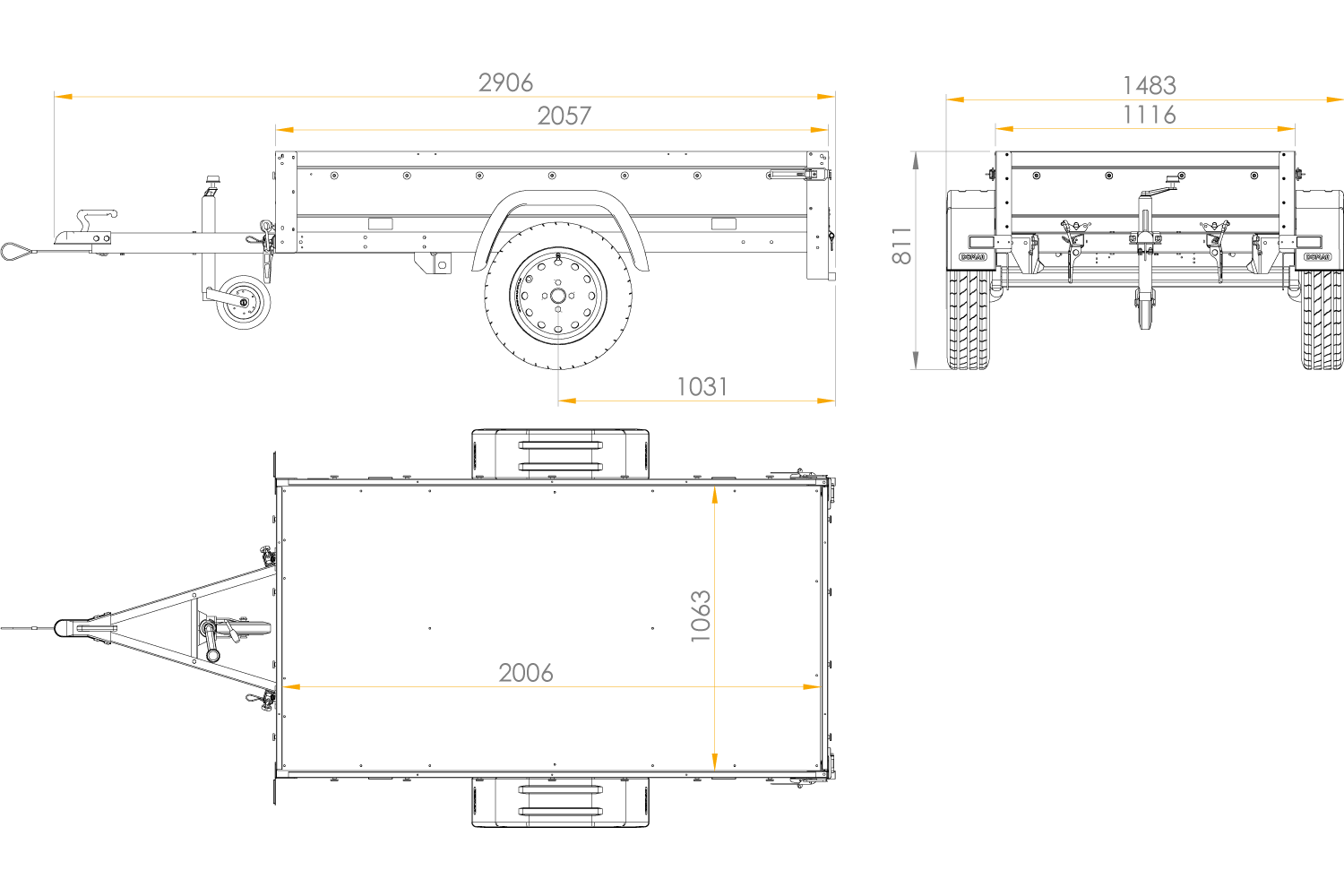 - CHASSIS – essieu de torsion d’un fabricant réputé ALKO ou Knott – fait sur mesure pour Unitrailer. Taille de roue : 155/70 R13. Timon basculant de type “V”, qui peut être replié sous le plancher de la remorque à tout moment.