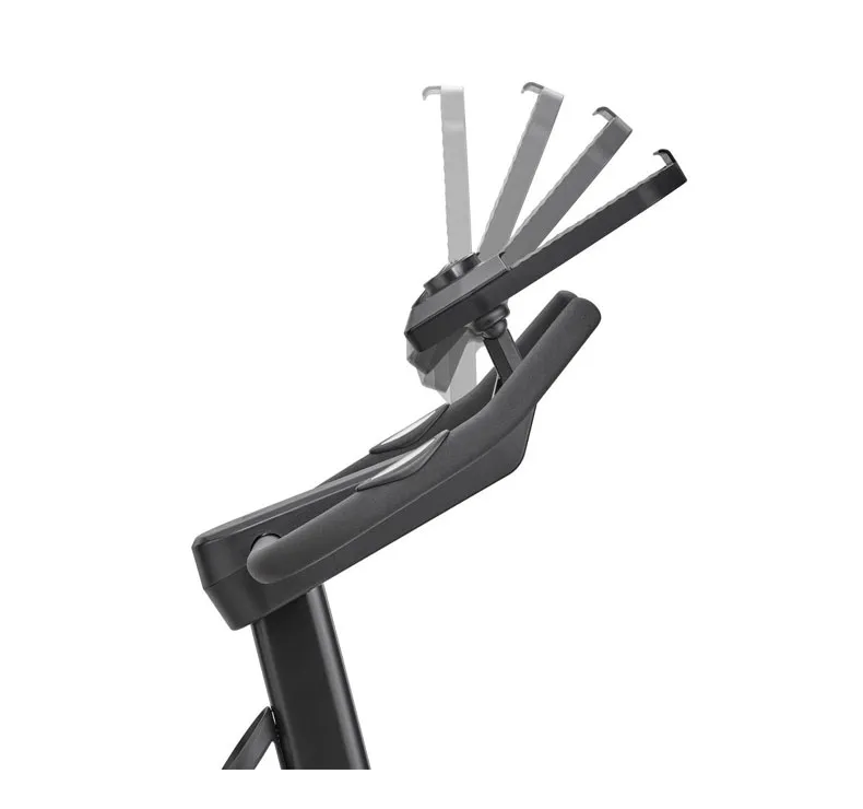 Le support pour tablette (tablette non incluse) et téléphone intégré à la console offre un angle de vision optimal. Restez connecté et alimenté pendant vos séances d’entraînement grâce au port de charge USB intégré. La selle rembourrée offre un positionnement optimal et un plus grand confort. Selle à double réglage vertical et horizontal. Pédales avec sangles réglables pour une performance optimale. Porte-bouteille à portée de main pour vous hydrater.
