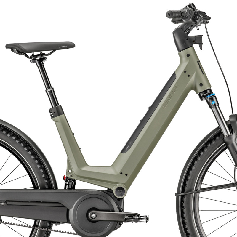 Le cadre en aluminium moulé du Moustache J. ALL Automatiq est fabriqué et usiné en France, un fait rare dans l’industrie du vélo électrique. Ce cadre monobloc est coulé sans soudure, utilisant un alliage AlSi10Mg T6 ultra-rigide. Son design sans haubans, sans tube supérieur, permet un enjambement bas, une accessibilité optimale, et une esthétique fluide primée plusieurs fois. La structure interne nervurée garantit une robustesse exceptionnelle.